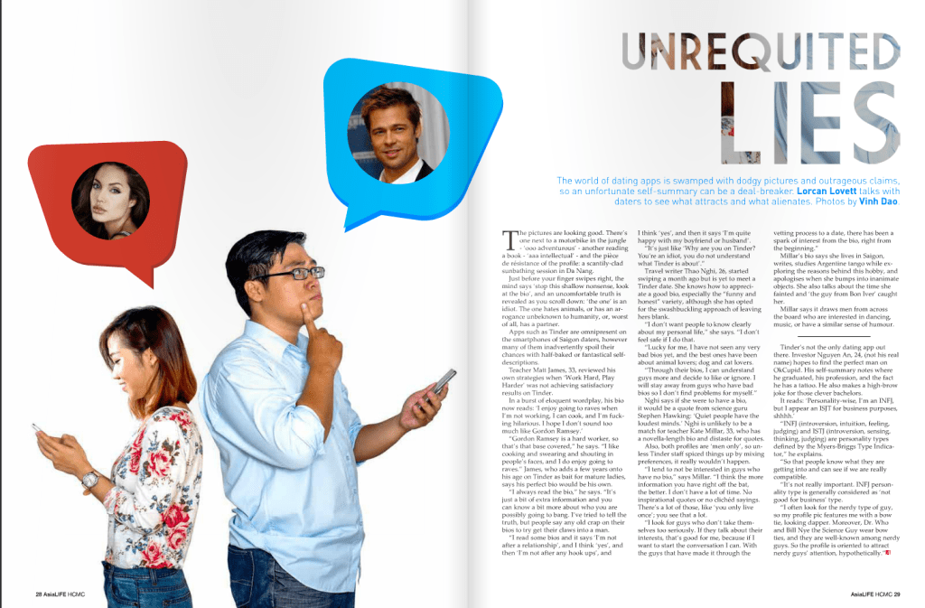 Apps such as Tinder are omnipresent on the smartphones of Saigon daters, however many of them inadvertently spoil their chances with half-baked or fantastical self-descriptions.