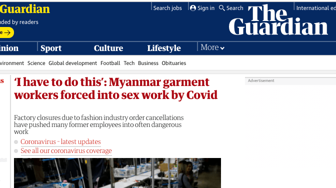 Guardian, 22 October 2020 When Hla, 19, tried to go back to work seven months ago after having a baby, there were no jobs. Hundreds of garment factories in Myanmar had closed after western fashion brands cancelled orders due to the pandemic, leaving thousands of women jobless. As lockdown gripped Yangon, her marriage broke down, her husband […]
